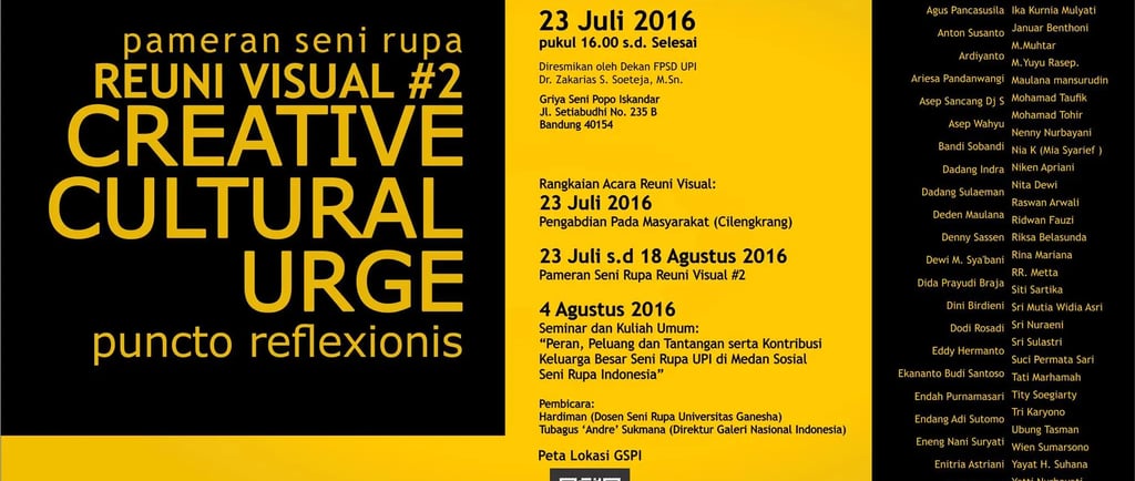 Acara ini dikuratori oleh Tri Karyono dan Rudi St. Darma, serta dibuka oleh Dekan FPSD UPI, Dr. Zakarias S. Soeteja, M.Sn. Pameran ini istimewa karena melibatkan puluhan alumni lintas angkatan dengan beragam profesi: dosen, guru, desainer, perupa, pengusaha, hingga birokrat, yang tinggal di berbagai daerah bahkan luar negeri.